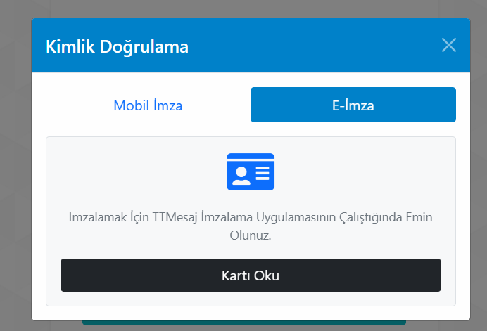 - Doğrulama başarılıysa, Kimlik Doğrulama alanı üzerinden E-İmza veya Mobil İmza yöntemi seçilir.